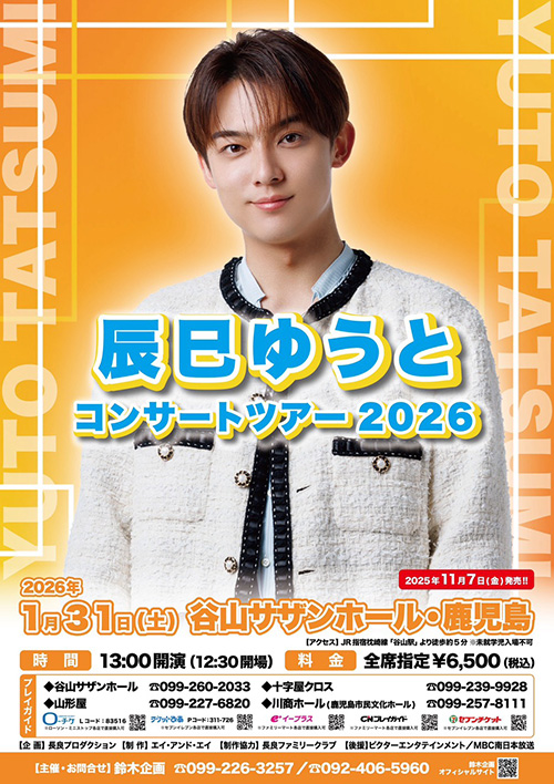 【一般発売情報!】1/31(土) 「辰巳ゆうとコンサートツアー2026」谷山サザンホール・鹿児島 11/7(金)10時より一般発売開始!